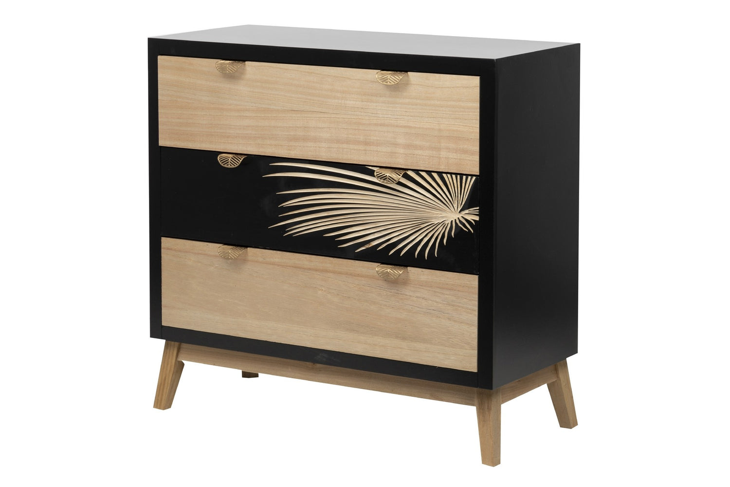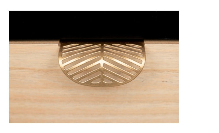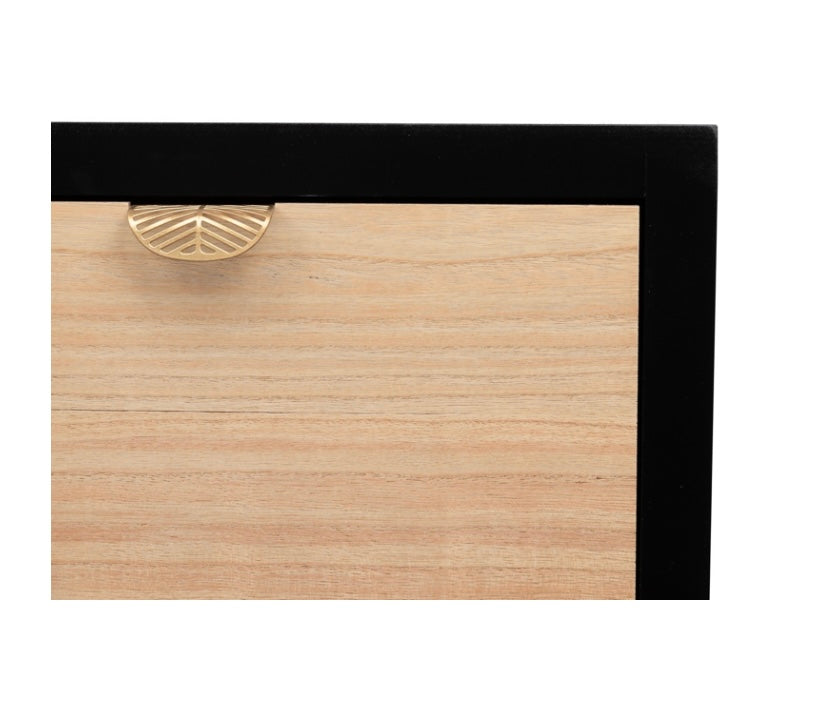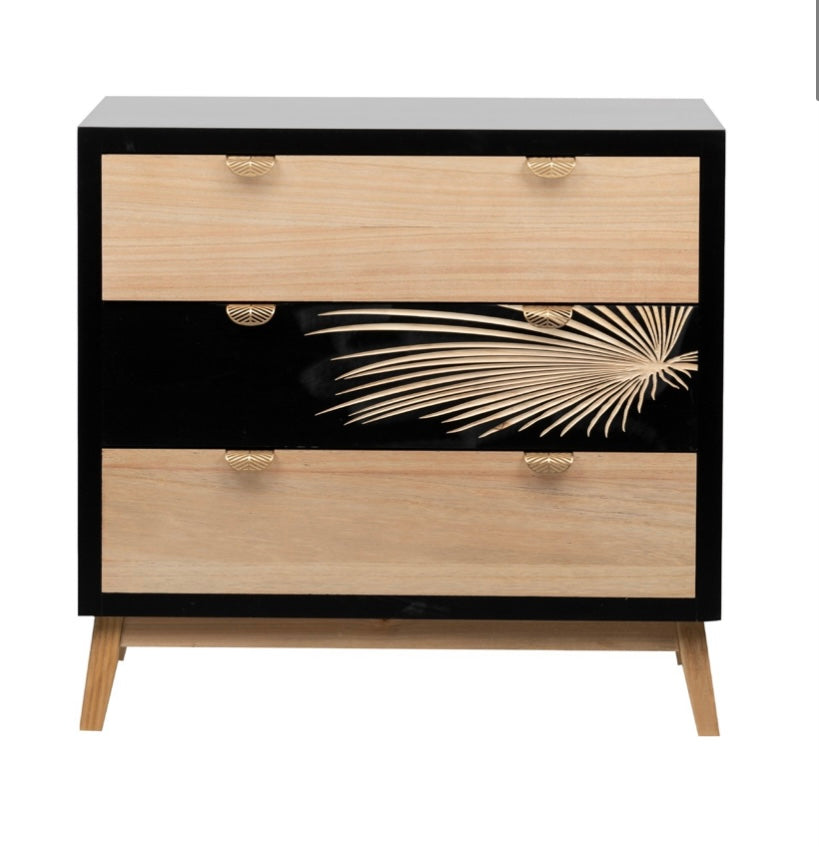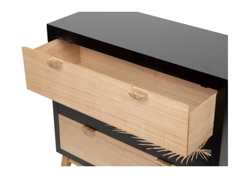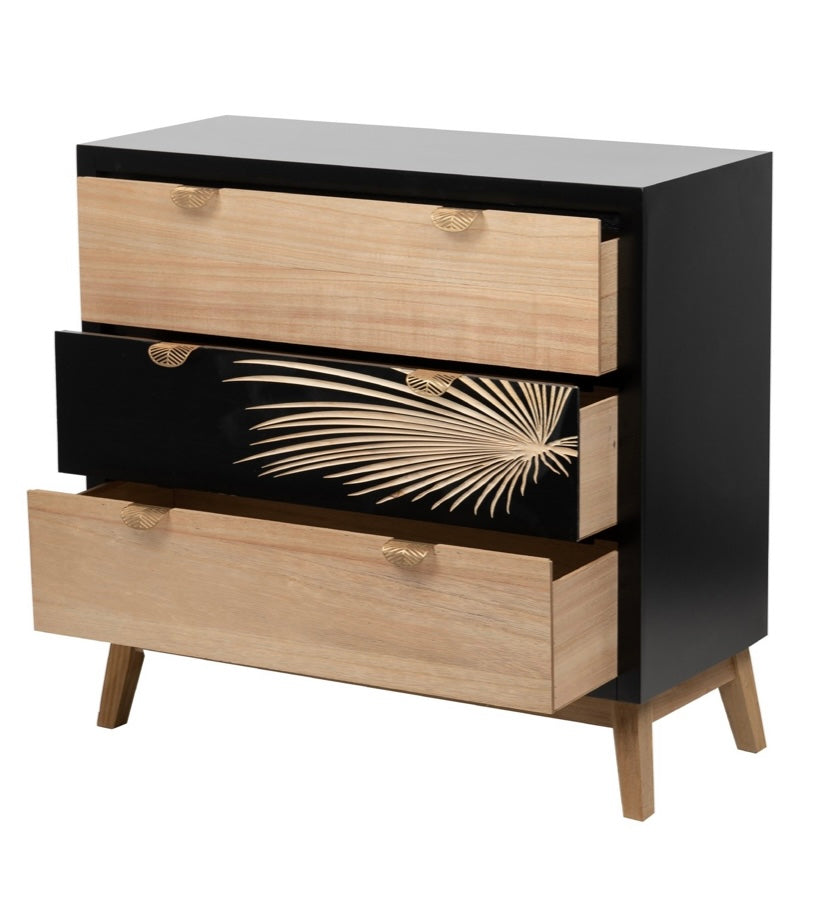 Sus tiradores en dorado en forma de hoja y la hoja tallada sobre la madera negra le aportan a esta cómoda “Albina” un diseño único y original que sin duda deslumbrará allá donde la pongas.