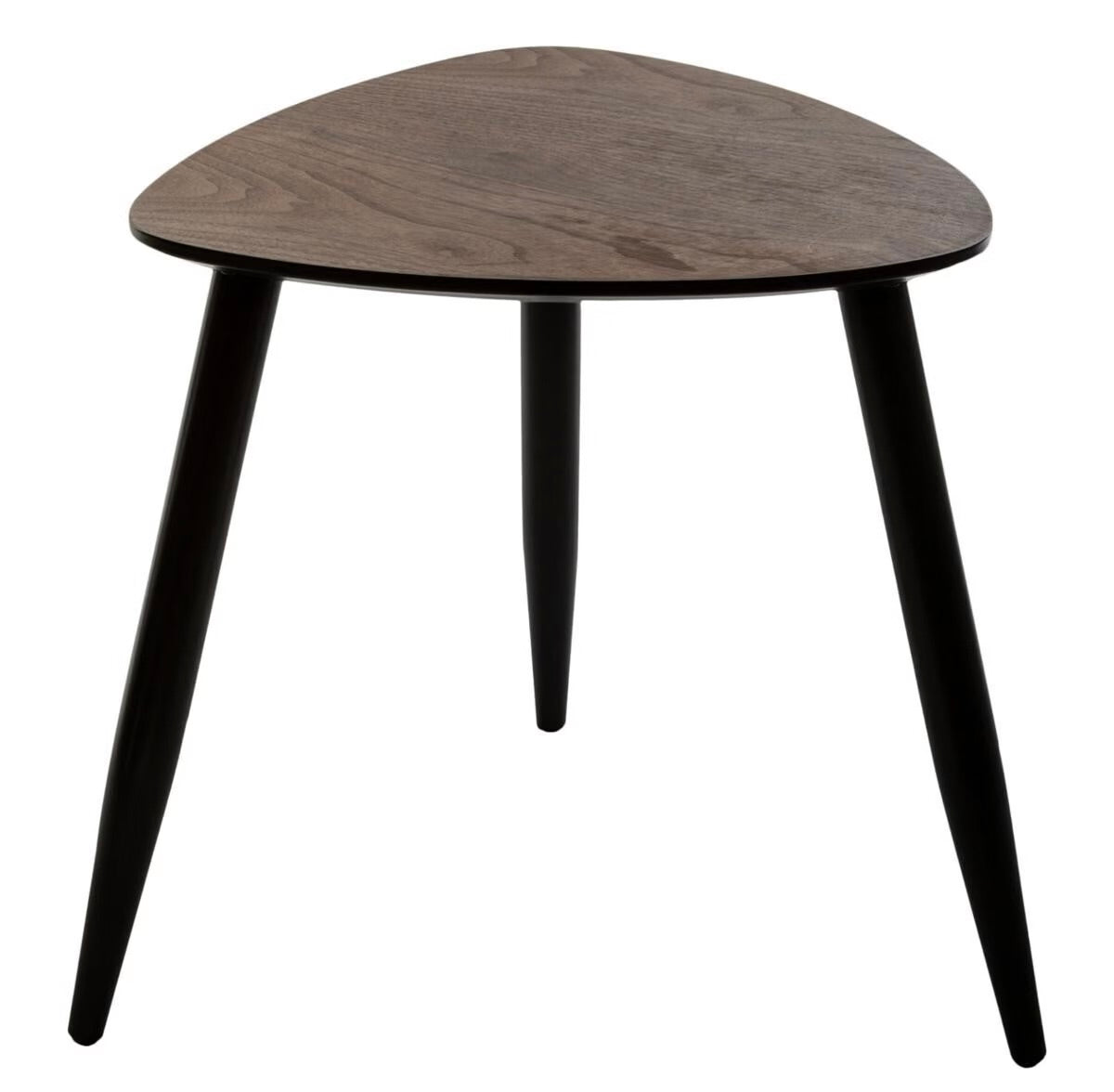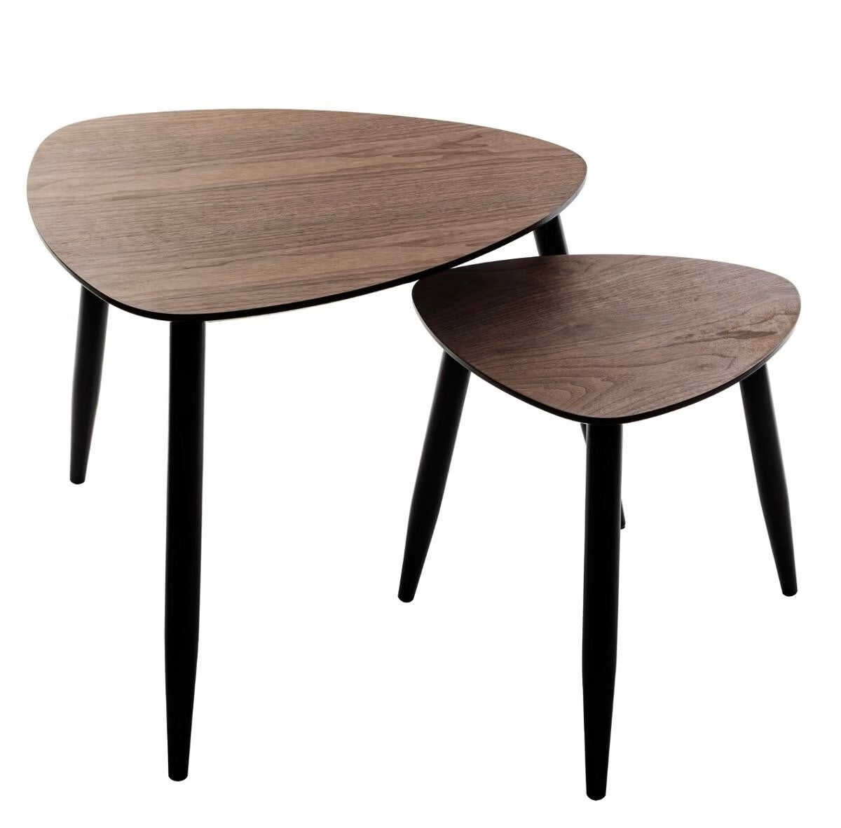 Estas 2 mesas auxiliares nido de color nogal se distinguen por su silueta bicolor. Las patas de compás hechas de madera de álamo realzan con refinamiento la tapa con revestimiento de nogal.